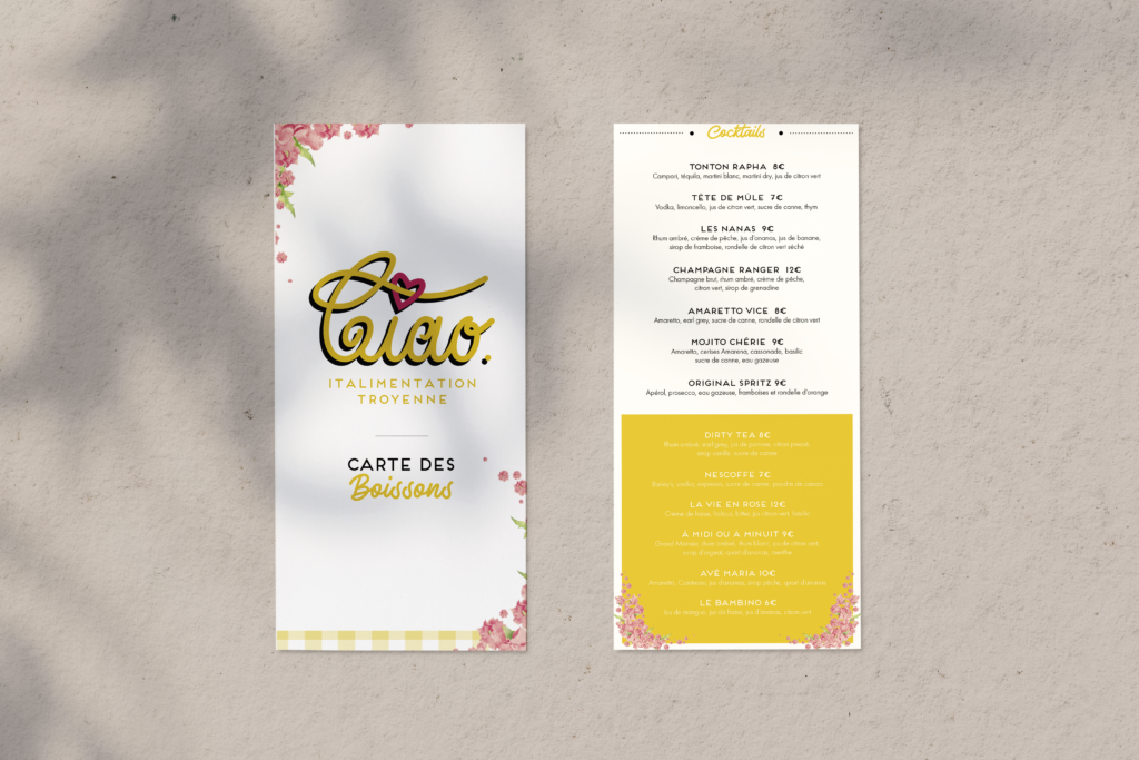 ✷ Ciao ✷ Mise en page Refonte de différents menus pour le restaurant italien Ciao (Troyes). «Précédent Suivant»